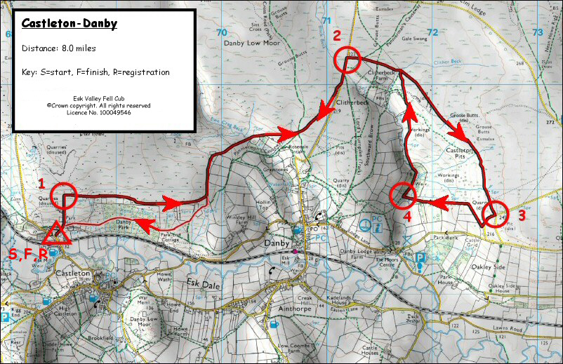 bring you to the road at Clitherbeck 711100 [CP1.] You now need to cross the road carefully so that you can head north along a wide verge for about 300M until you come to a white fence that is really a small bridge over Black Beck. As soon as you cross turn NE and run along the edge of the wall until you reach the public footpath that takes you round Clither Beck Farm. After a while you come back to Pannierman’s Causeway. Do not follow this path but continue round the outside of the farm fence heading in a more ESE direction until you reach 717102.[CP2.] You now follow a wide track across Castleton Pits. (After you have changed maps.) This track will bring you to the road above Poverty Hill at 725087. (The old full route headed up the road to Beacon Hill at 737093 [CP3] and then after touching the cairn you had to retrace your steps to 725087) The current route does NOT visit the Beacon but turns right at the road for 200M until it picks up a small footpath that will take you to the wall corner at 725088. Follow the line of the wall directly East for a little short of a Kilometer when you will swing to cross a footbridge across Black Beck at 718089.[CP4.] Now head NE past the Weir to a second footbridge at 719092. You now head in a general northerly direction to return to 717102 [CP5.] on the corner of the fence at the North Eastern end of Clither Beck Farm enclosure. Now retrace your steps to Danby Park Wood gate at 694086,[CP6.] As you enter the wood take the lower path through the wood and then follow the fence/ wall line to Park Nook and the finish just before the road and station. You are now within 100M of The Eskdale Hotel where refreshments and presentation usually take place.